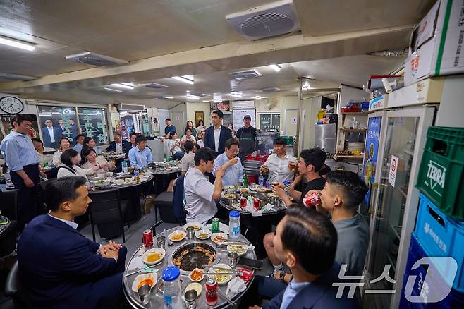 (서울=뉴스1) 허경 기자 = 이재명 대통령이 지난 11일 저녁 서울 종로구의 한 고깃집에서 시민, 직원들과 퇴근길 외식을 하고 있다. 이 대통령은 "소비 진작을 위해 저부터 외식을 많이 하겠다"고 강조하며 경기 활성화를 위한 실천 의지를 내비쳤다. (대통령실 제공. 재판매 및 DB 금지) 2025.7.12/뉴스1