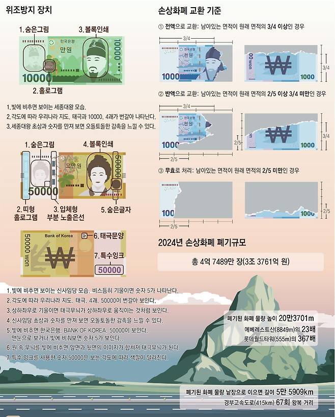 폐기된 화폐를 한 장씩 길게 이으면 총 길이 5만5906km로, 경부고속도로(415km)를 약 67회 왕복한 거리다. 한 장씩 쌓았을 때 총 높이 20만3701m는 에베레스트산(해발 8849m)의 23배, 서울 송파구 룻데월드타워(555m)의 367배에 달한다.