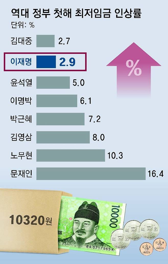 역대 정부 첫해 최저임금 인상률은 △김영삼 정부 8% △김대중 정부 2.7% △노무현 정부 10.3% △이명박 정부 6.1% △박근혜 정부 7.2% △문재인 정부 16.4% △윤석열 정부 5.0%다.