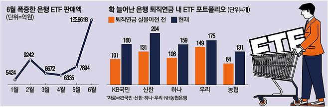 11일 KB국민·신한·하나·우리·NH농협 등 5대 시중은행에 따르면 지난 한 달간 은행서 판매된 ETF는 금액으로 1조6618억원에 달했다. 이는 전월 7894억원의 2배가 넘는 수치이며, 작년 같은 기간(2024년 6월)과 비교해도 1.6배에 달할 정도로 많은 것이다.