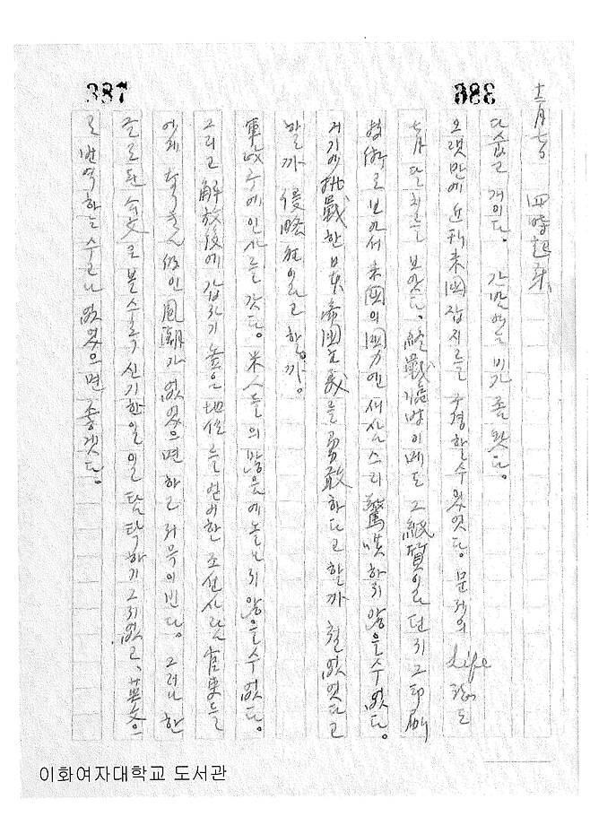 오랜만에 근간 미국 잡지를 구경할 수 있었다. 문제의 『라이프』지도 7월달 치를 보았다. 종전(終戰) 임시임에도 그 지질(紙質)이라든지 그 인쇄기술로 보아서 미국의 국력엔 새삼스레 경탄하지 않을 수 없다. 거기에 도전한 일본제국주의를 용감하다고 할까 철없었다고 할까 침략광이라고 할까.
