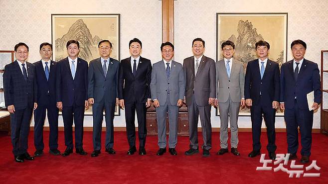 김민석 국무총리와 김병기 더불어민주당 대표 직무대행 겸 원내대표, 강훈식 대통령 비서실장 등이 6일 오후 서울 종로구 삼청동 국무총리 공관에서 열린 이재명 정부 첫 고위당정협의회에서 기념촬영을 하고 있다. 박종민 기자