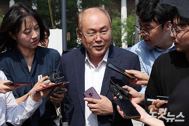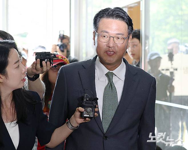 정창래 삼부토건 전 대표가 9일 오전 서울 종로구 김건희 특검팀 사무실에 피의자 신분으로 출석하고 있다. 정 전 대표는 주가 조작 혐의 인정 여부를 묻는 질문에 대해 "들어가서 소명하도록 하겠다"고 답했다. 또한 폴란드 포럼에 참석한 원희룡 전 국토부장관에 대해서는 "저는 관계 없다"고 선을 그었다. 류영주 기자
