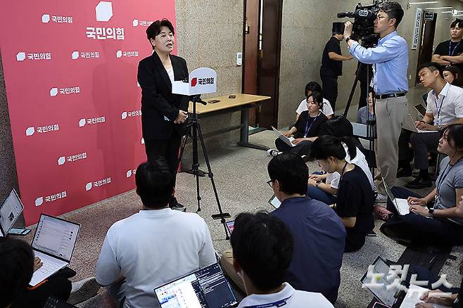국민의힘 윤희숙 신임 혁신위원장이 9일 국회에서 취재진의 질문에 답변을 하고 있다. 윤 위원장은 "특정인들에게 칼을 휘두를 권한을 우리 당원은 어떤 개인에게도 준 적이 없다" 며 "혁신의 주체는 우리 당원들"이라고 말했다. 윤창원 기자