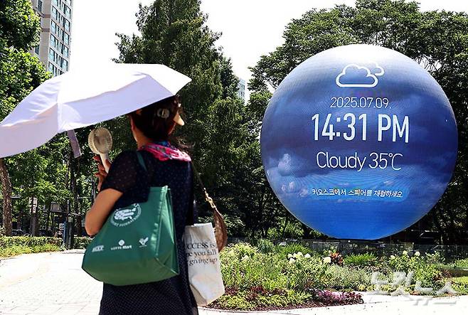 전국 대부분 지역에 폭염경보가 발효된 9일 오후 서울 송파구 조형물에 서울의 기온이 35도를 나타내고 있다. 황진환 기자