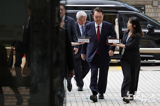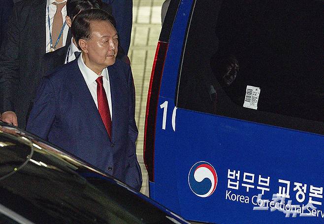 윤석열 전 대통령이 9일 서울 서초구 서울중앙지방법원에서 열린 영장실질심사를 마치고 대기 장소인 서울구치소로 향하고 있다. 윤 전 대통령은 지난 3월 8일 법원의 구속취소 결정으로 석방된 지 약 4개월만에 재구속됐다. 넉 달 전엔 '수용번호 10'의 현직 대통령 신분이었지만, 이번엔 '수용번호 3617'을 부여받고 에어컨 없는 2평대 독방에 수용됐다. 사진공동취재단