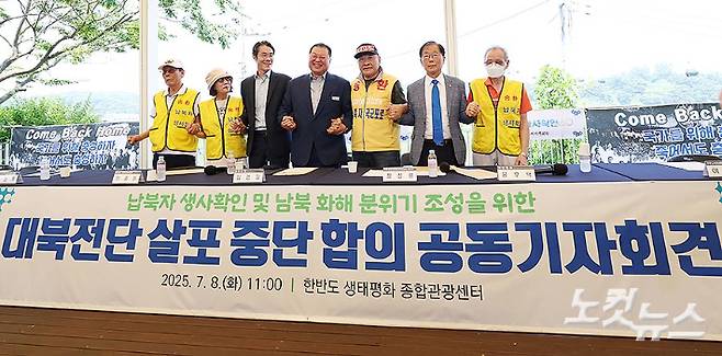 8일 오전 경기 파주시 임진각에서 열린 '파주시-납북자가족모임, 대북 전단 살포 중단 공식 선언 공동 기자회견'에서 김경일 파주시장, 최성룡 납북자가족모임 대표, 윤후덕 더불어민주당 의원 등 참석자들이 대북전단 살포 중단 선언문을 발표한 후 손을 맞잡은 채 기념촬영을 하고 있다. 파주=류영주 기자