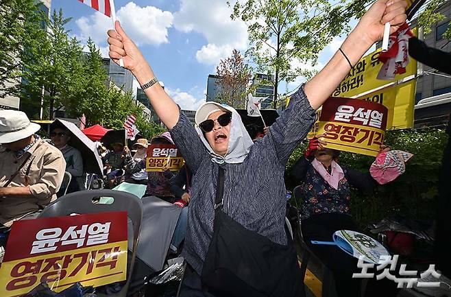 윤석열 전 대통령의 재구속 여부를 가를 구속 전 피의자심문(영장실질심사)이 열린 9일 오후 서초구 서울중앙지방법원 인근에서 윤 전 대통령 지지자들이 재구속을 반대하는 집회를 갖고 있다. 황진환 기자