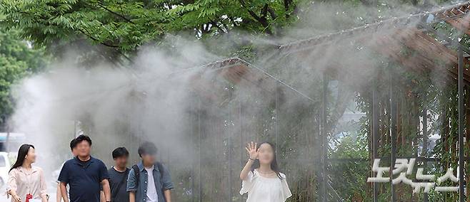 서울의 낮 기온이 37.8도까지 오르며 근대적인 기상관측을 시작한 이래 7월 상순 기온으론 역대 최고치를 기록한 8일 오후 서울 중구 서울광장에서 시민들이 쿨링포그 앞을 지나며 더위를 식히고 있다. 류영주 기자