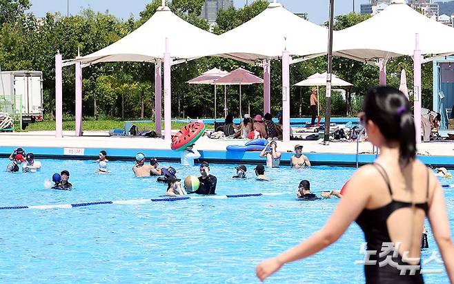 7월 초부터 기록적인 폭염이 이어지고 있는 가운데 10일 오후 서울 여의도 한강공원 수영장을 찾은 시민들이 물놀이를 하며 더위를 식히고 있다. 기상청은 티베트고기압과 북태평양고기압이 우리나라를 덮어 전국적으로 더운 상황이 며칠째 계속되고 있다고 설명했다. 이어 이례적으로 찾아온 7월 폭염은 다음주까지도 이어질 전망이며, 다음주 중부지방에는 오랜만의 장맛비가 내릴 것으로 예보했다. 황진환 기자
