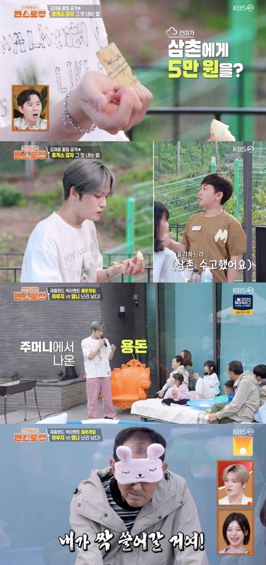 그런가 하면, 김재중은 조카로부터 용돈을 받아 감동 받는 모습을 보였다. 맛있는 간식을 해준 김재중에 조카는 “이거 값이에요”라며 고마움에 5만원 용돈을 건낸 것. 김재중 어머니는 “지 용돈으로 준 거다”라고 했고, 감동받은 김재중은 “조카한테 팁을 받았다”라며 “고마워”라며 포옹했다.
