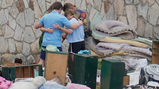 ▲ 텍사스 헌트에 위치한 캠프 미스틱에서 한 경찰관이 물품을 수령하러 온 가족과 함께 기도하고 있다.