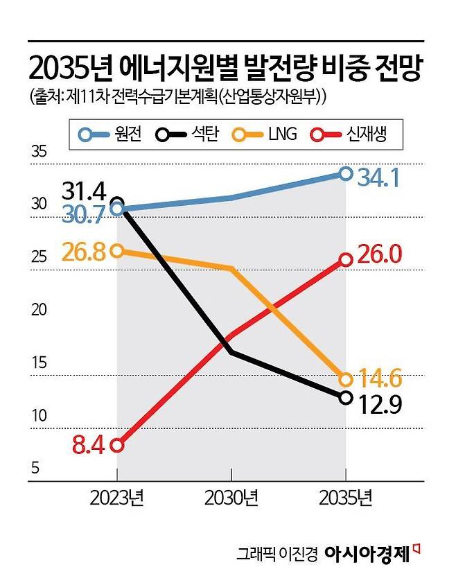 정부는 2016년 파리협정에 공식 가입하면서 2030년까지 온실가스 배출을 2018년 대비 40% 감축하겠다는 목표를 세웠다. 온실가스 배출을 줄이기 위해 올해 12월 태안 1호기를 시작으로 석탄화력발전소를 연쇄적으로 폐쇄할 예정이다. 발전소가 폐지되면 1·2차 협력사도 운영이 어렵다. 산업통상자원부가 지난 3월 발표한 제11차 전력수급기본계획(2024~2038년)에 따르면 원별 발전량은 2023년 기준 석탄과 원전이 각각 31%, 액화천연가스(LNG) 27%, 신재생 10%를 차지하고 있다. 2038년까지 석탄은 12.9%로 낮추고, 신재생은 26.0%까지 끌어올리는 것이 목표다.