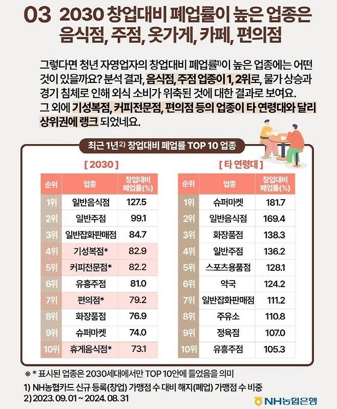 2023년 9월부터 2024년 8월까지 1년 간 2030대의 창업 대비 폐업률이 높은 업종은 일반음식점·일반주점이 각각 1~2위를 차지했다. 일반음식점의 창업 대비 폐업률은 127.5%, 일반주점은 99.1%로 나타났다. 일반잡화판매점(84.7%), 기성복점(82.9%), 커피전문점(82.2%)이 뒤를 이었다.
