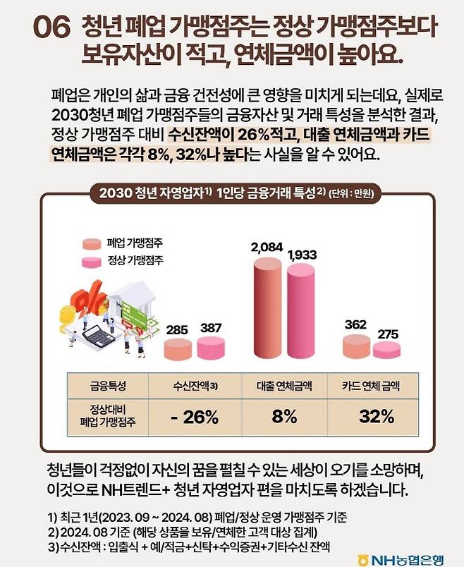 청년 폐업은 금융자산 감소, 연체율 증가로 직결됐다. 2030대 폐업 가맹점주의 농협은행 수신잔액은 같은 세대 정상 가맹점주에 비해 26%나 낮았다. 대출 연체금액은 폐업 가맹점주(2084만원)가 정상 가맹점주(1933만원)에 비해 8% 높았다. 카드 연체금액은 정상 가맹점주가 275만원, 폐업 가맹점주의 경우 362만원으로 32% 더 많은 것으로 집계됐다.