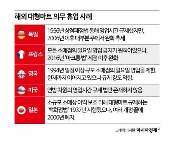 한편 한국과 비슷하게 공휴일에 대형마트 영업을 제한했던 다른 선진국은 최근 소비 패턴 변화에 맞춰 규제를 완화하는 추세다. 1956년 상점 영업시간을 제한하는 '상점폐점법'을 제정했던 독일은 2006년 이후 대부분 주에서 제약을 풀었으며, 프랑스는 2016년 일명 마크롱 법을 통해 대형마트의 주말 영업 제한을 완화했다. 일본도 소규모 점포를 보호하기 위해 대규모 점포 영업을 제한하는 백화점법을 1937년 시행했지만, 논란 끝에 2000년 폐지했다.