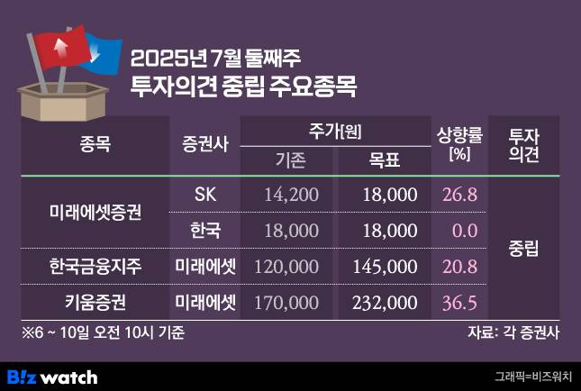 증권가에선 20개사의 투자의견을 '매수'에서 '중립'으로 낮췄지만 그 중 12개 회사의 목표가를 올려 잡았다. 투자의견과 목표주가의 방향이 정반대로 향한 것이다. 국내 증시 강세에 따라 주가가 치솟은 회사의 목표가를 높여 잡았지만, 추가 상승 여력이 부족하다고 판단해 투자의견을 조정한 것이다. 이 가운데 증권주가 주목받는다.