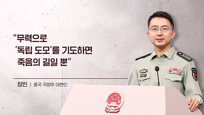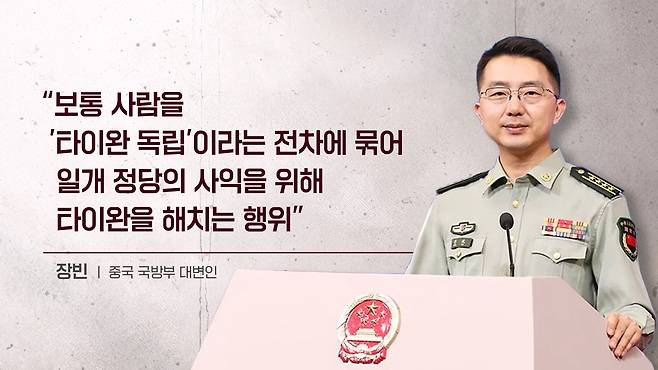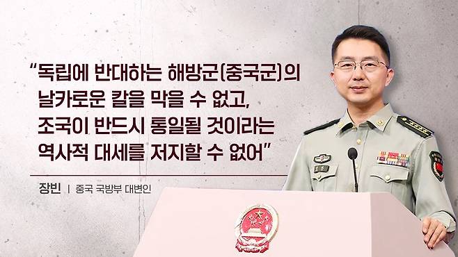 지난 8일 장빈 중국 국방부 대변인은 이번 훈련에 대해서 뭐라고 말했냐면요. 민진당 당국, 현재 타이완의 집권 여당인데요. 이 집권 여당을 겨냥해서, '보통 사람을 '타이완 독립'이라는 전차에 묶어서, 일개 정당의 사익을 위해 타이완을 해치고 있다', '무력으로 독립 도모를 기도하면 죽음의 길 뿐이다', 이렇게 이야기를 하면서 '뭐라고 하든, 무슨 무기를 쓰든 독립에 반대하는 해방군, 그러니까 중국군 내 날카로운 칼을 막을 수가 없고, 조국이 반드시 통일될 것이라는 역사적인 대세를 저지할 수 없을 것이다'라고 말을 했습니다.