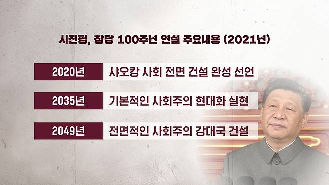 이른바 '샤오캉 사회 전면 건설' 이것이 2020년에 이미 이루어졌다라고 주장한 데 이어서 오는 2035년까지는 기본적인 사회주의 현대화를 실현하겠다라고 약속을 했고요. 또 오는 2049년까지는 그러니까 이게 중국 건국 100주년인데 이때까지는 '전면적인 사회주의 강대국 건설을 하겠다' 이렇게 약속을 합니다. 이러한 중국 특색 사회주의 발전 노선이라는 것을 대내외에 공표를 하게 되는데요.