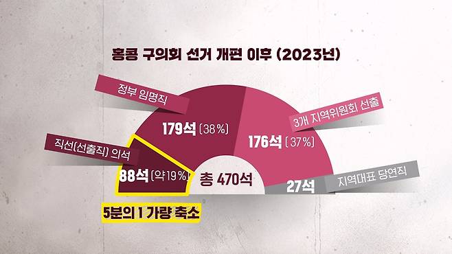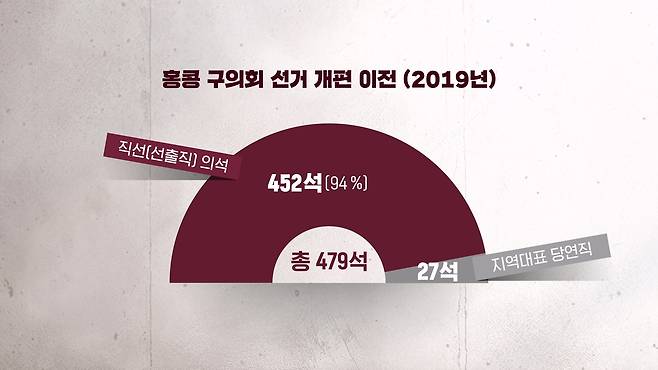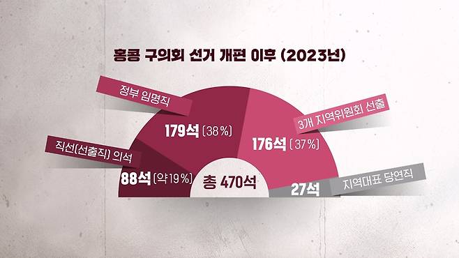 이렇게 주민이 직접 뽑는 직선 의석 대신에 정부가 임명하는 정부 임명직 179석, 그리고 친중 진영이라고 볼 수 있는 3개의 지역위원회 선출이 176석 그리고 지역 대표 당연직은 27석, 이렇게 규정이 되고 또 의장도 정부 관리가 맡도록 규정이 됐습니다. 그래서 민주 진영이 실질적으로 의석을 확보할 수 없는 구조가 되었습니다.