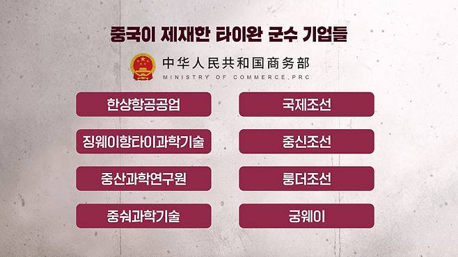 중국 상무부도 이번 타이완의 훈련에 대응해서 총 8개의 타이완 군수 기업에 제재를 가하기도 했습니다. 그 배경에 대해선 이들 8개 기업이 '타이완 독립 분열 세력이 무력으로 독립을 도모하는 데 협력을 해왔다'라고 하면서 수출 통제 조치의 배경을 밝혔습니다.