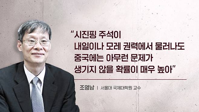 조영남 서울대 국제대학원 교수는 "단적으로 시진핑 주석이 건강 악화나 기타 이유로 인해서 내일이나 모레 권력에서 물러나도 중국에는 아무런 문제가 생기지 않을 확률이 매우 높다"고 분석했습니다. 그러면서, 지난해 베트남에서 벌어진 갑작스러운 최고 통치자의 교체, 즉 응우옌푸쫑이 지병으로 갑자기 숨진 후 한 달 뒤 또럼 국가주석이 총서기직을 승계했는데, 1년이 지난 지금 베트남의 정치·경제 시스템에는 뚜렷한 혼란이나 불안정 징후가 없으며, 체제의 연속성과 안정성이 유지되고 있다는 점도 짚었습니다.