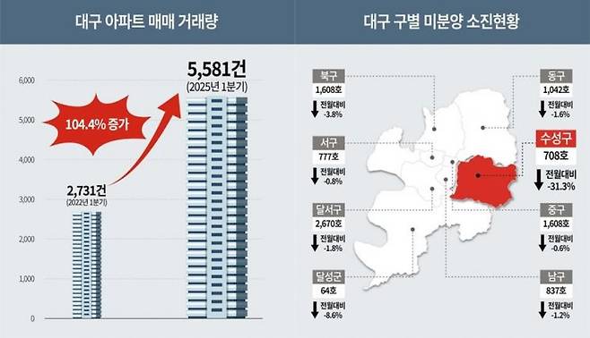 대구가 전국에서 올해 1분기 기준 지방 아파트 매매 거래량이 가장 많이 증가한 것으로 나타났다. 대구 아파트 매매 거래량은 5581건으로 2022년 1분기(2731건) 대비 104.4% 증가했다. 특히 수성구는 같은 기간 247건에서 802건으로 약 3배(약 224%) 가까이 급증해 대구 전체 상승세를 주도했다. 이는 전국 평균 증가율(48.1%)을 크게 웃도는 수치이다. 이는 전국 평균 증가율(48.1%)을 크게 웃도는 수치이다.