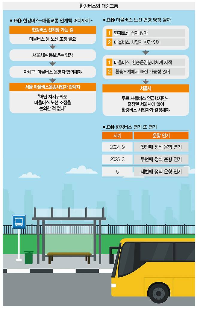 세 차례나 미뤄졌던 한강버스 정식운항까지 이제 2개월밖에 남지 않았다(표③). 그런데도 한강버스의 성공 요인 중 하나인 '대중교통 연계책'은 아직 마침표가 찍히지 않았다. 서울시는 '한강버스 9월 출항'을 아무런 문제 없이 진행할 수 있을까.