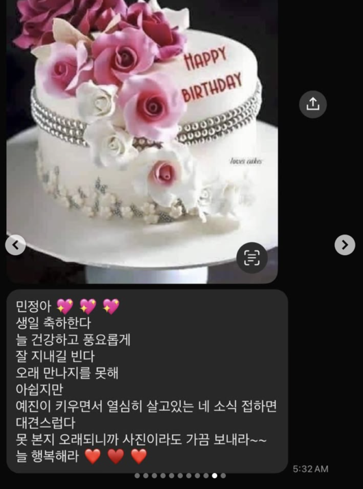 서민정이 공개한 메시지에는 부모님이 애정 가득한 카톡이 담겼다. 부모님은 ‘민정아 생일 축하한다. 늘 건강하고 풍요롭게 잘 지내길 빈다. 오래 만나지를 못해 아쉽지만 예진이 키우면서 열심히 살고있는 네 소식 접하면 대견스럽다. 못 본지 오래되니까 사진이라도 가끔 보내라~~ 늘 행복해라’고 그리운 마음을 전했다.