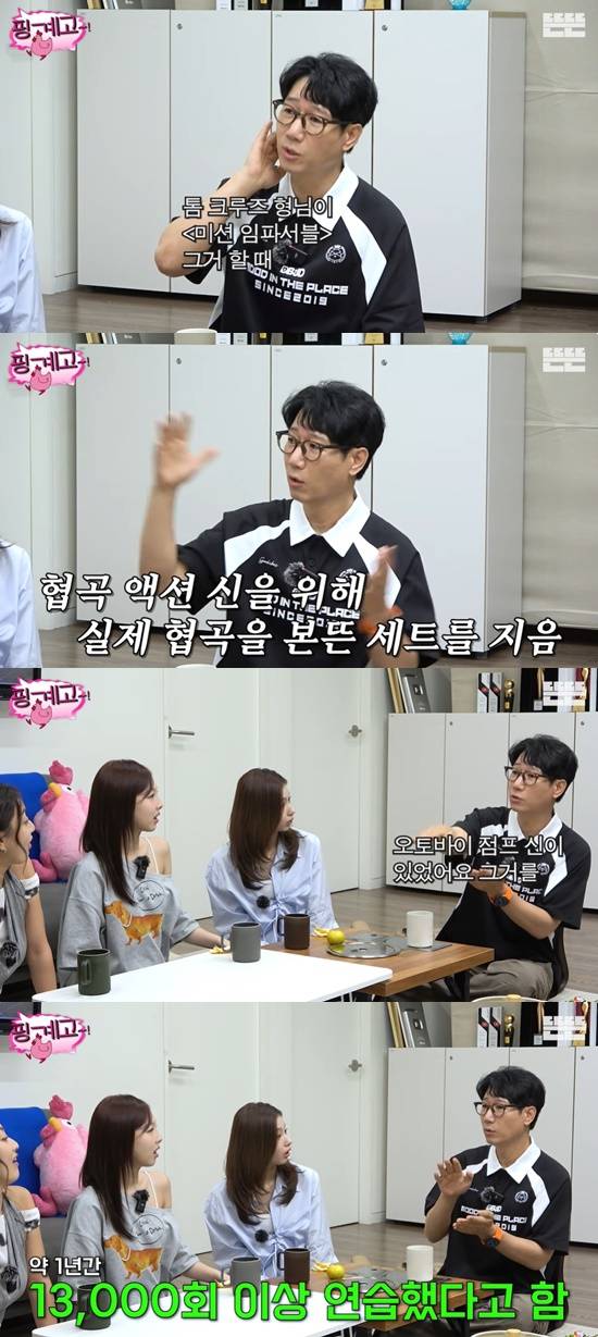 이를 들은 지석진은 "이런 걸 어디서 들었냐면, 톰 크루즈 형님이 '미션 임파서블' 그거 할 때 유명한 장면 찍을 때 협곡에 세트를 지어놓고 했다고 하더라. 오토바이 점프 신이 있었다. 그걸 6개월인가 연습해서 똑같이 했다고 하더라. 글로벌 팀은 다르네"라고 감탄했다.
