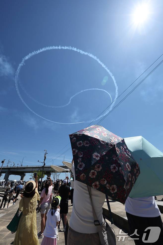 (서울=뉴스1) 신웅수 기자 = 12일 오전 서울 반포한강공원 일대에서 공군 특수비행팀 블랙이글스가 제1회 방위산업의 날 계기 시민 참여 페스티벌을 기념해 에어쇼를 펼치고 있다. 2025.7.12/뉴스1