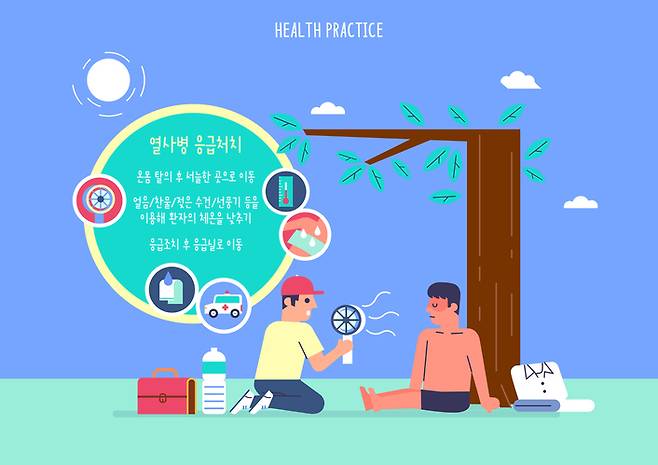 환자에게 의식이 있으면 시원한 물을 마시게 합니다. 의식이 없으면 물이 기도로 넘어갈 수 있어 억지로 물을 먹이면 안 됩니다. 상태가 위급하면 119에 신고하고, 구급차를 기다리면서 가능한 한 빠르게 체온을 39℃ 이하로 떨어뜨리도록 합니다. '신속한 냉각'이 생명을 구할 수 있습니다.