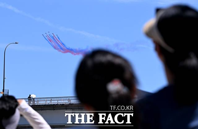 [더팩트ㅣ이새롬 기자] 12일 서울 서초구 반포한강공원 일대에서 제 1회 방위산업의 날 제정(7월 8일)을 기념해 시민 참여 페스티벌 행사가 열린 가운데, 공군 특수비행팀 블랙이글스가 축하 비행을 하고 있다.