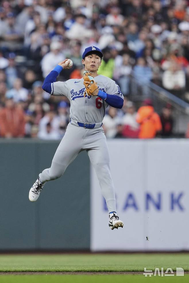 [샌프란시스코=AP/뉴시스] LA 다저스 2루수 김혜성이 11일(현지 시간) 미 캘리포니아주 샌프란시스코 오라클 파크에서 열린 2025 메이저리그 샌프란시스코 자이언츠와의 경기 2회 말 수비하고 있다. 김혜성은 3회 초 선두 타자로 나와 우전 안타와 도루를 기록했고 이어 오타니 쇼헤이의 2점 홈런(시즌 32호)으로 홈을 밟았다. 2025.07.12.