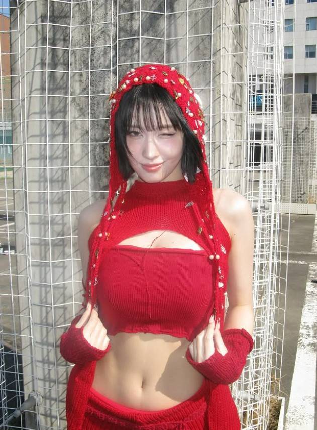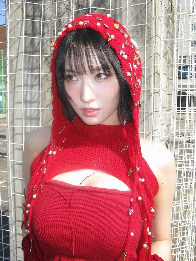 공개된 사진 속 모모는 크롭 길이의 레드 니트 브라탑 상의를 착용했다. 컷아웃 디테일이 과감한 포인트를 더했으며, 어깨와 팔 라인을 스치며 내려오는 슬리브리스 후드 니트는 전체 스타일링에 감성적인 무드를 자아냈다.