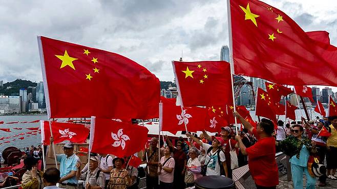 ▲ 지난 1일 홍콩에서 열린 주권반환 기념 행사에서 참가자들이 중국 국기와 홍콩 특별행정구 깃발을 흔들고 있다.