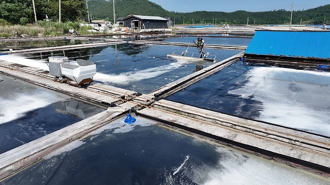 드론으로 바라본 도초도 염전의 모습이다. 하얀 소금 결정이 맺혀 있는 모습이 보이고 있다.