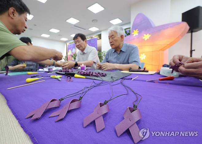 (서울=연합뉴스) 류영석 기자 = 12일 이태원 참사 기억소통공간인 서울 종로구 별들의집에서 유가족 등 참가자들이 오는 24일 참사 발생 1천일을 맞이하며 추모 목걸이를 함께 만들고 있다. 2025.7.12