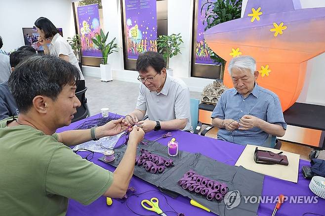(서울=연합뉴스) 류영석 기자 = 12일 이태원 참사 기억소통공간인 서울 종로구 별들의집에서 유가족 등 참가자들이 오는 24일 참사 발생 1천일을 맞이하며 추모 목걸이를 함께 만들고 있다. 2025.7.12