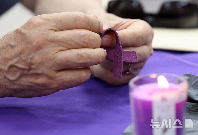 [서울=뉴시스] 김진아 기자 = 10·29 이태원참사 유가족협의회·시민대책회의를 비롯한 참석자들이 12일 서울 종로구 별들의집에서 열린 10.29 이태원 참사, 함께 만드는 1000일 '1000개의 별목걸이 함께 만들어요'에서 보라리본 목걸이를 만들고 있다. 2025.07.12. bluesoda@newsis.com