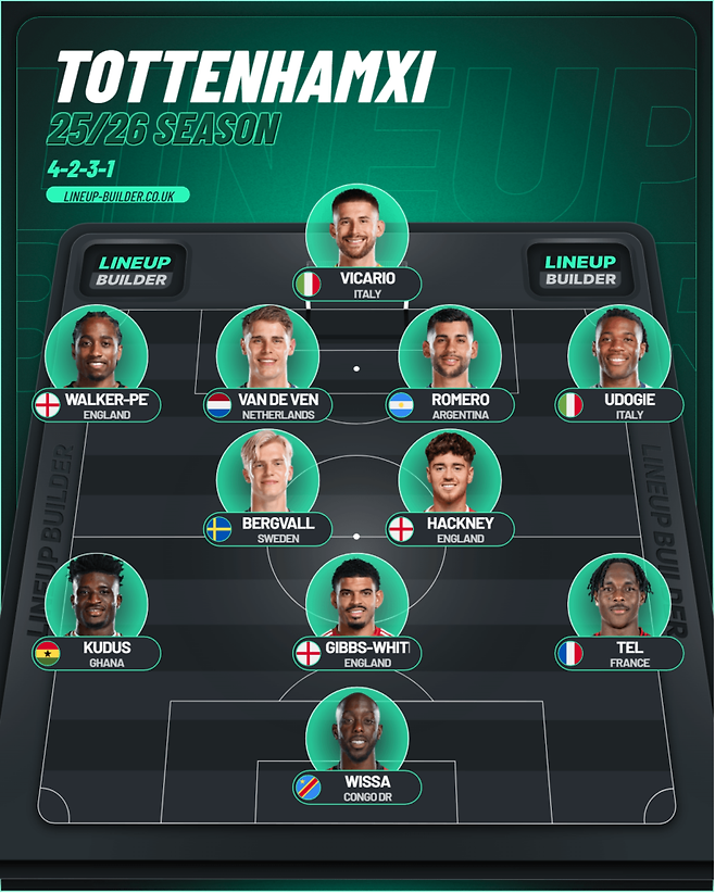 손흥민의 거취가 여전히 불투명한 가운데 토트넘의 2025-2026시즌 예상 베스트 일레븐이 공개됐다. 10년 동안 토트넘의 붙박이 윙어로 활약하던 손흥민의 모습은 사라졌고, 대신 지난 시즌 토트넘에서 임대로 활약한 2005년생 공격수 마티스 텔과 최근 토트넘에 합류한 신입생 모하메드 쿠두스가 손흥민의 빈자리를 채웠다.