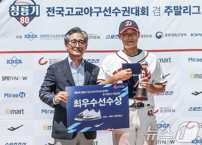 (서울=뉴스1) = 12일 서울 양천구 목동야구장에서 열린 제80회 청룡기 전국고교야구선수권대회 결승전 경기에서 최우수선수상(MVP)를 차지한 덕수고 설재민이 기념사진을 찍고 있다.