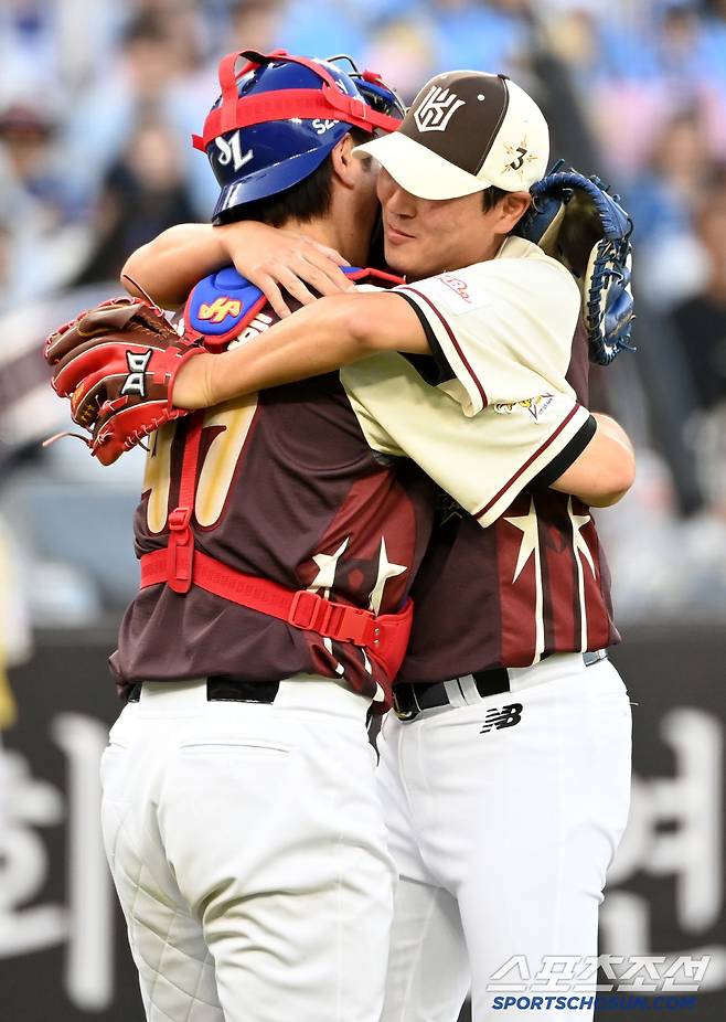 12일 대전 한화생명볼파크에서 열린 2025 KBO 올스타전, 강민호와 우규민이 포옹을 하고 있다. 대전=허상욱 기자wook@sportschosun.com/2025.07.12/