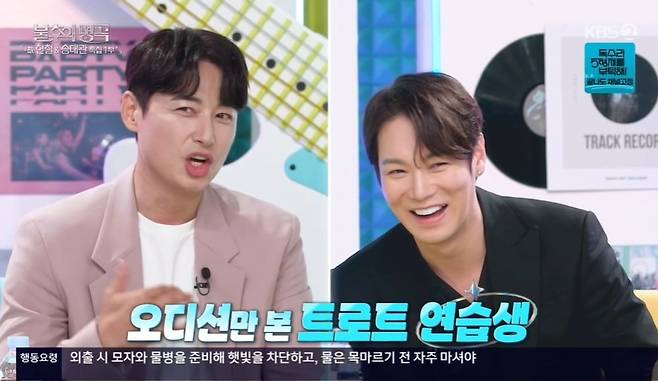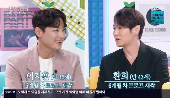 가수 데뷔 30년 차 이지훈과 데뷔 27년 차 환희는 트로트 가수로는 6개월 정도 됐다고. 이지훈은 "솔직히 데뷔했다고 볼 순 없다. 정식 앨범이 아직 안 나왔으니까. 저희는 그냥 오디션만 봤다. 연습생 기간을 지내고 있다"라고 겸손하게 말했다. 환희는 황민호를 가리키며 "최고의 선배님"이라고 말하기도.