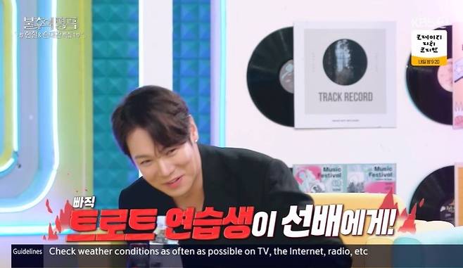 이에 이찬원은 "지금 연습생이 (선배에게)"라고 발끈한 척했고, 이지훈은 환희에게 빨리하라고 속삭이며 장단을 맞추었다. 진해성은 "세상이 많이 바뀌었다니까"라고 거들어 웃음을 안겼다. 이어 환희는 '무정블루스'를 바로 선보였다.