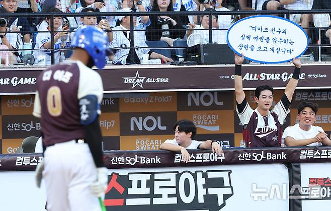[대전=뉴시스] 최진석 기자 = 12일 대전 중구 대전한화생명볼파크에서 열린 2025 KBO리그 올스타전 드림 올스타와 나눔 올스타의 경기. 1회초 드림 구자욱이 디아즈의 여권 압수 퍼포먼스 푯말을 들고 있다. 2025.07.12. myjs@newsis.com
