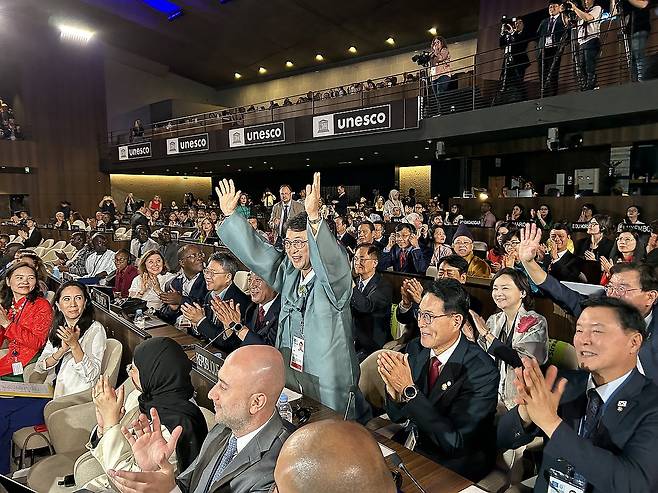 (파리=연합뉴스) 김예나 기자 = 12일(현지시간) 프랑스 파리 유네스코 본부에서 열린 제 47차 세계유산위원회에서 '반구천의 암각화'가 세계유산으로 등재되자 최응천 국가유산청장이 환호하고 있다. 2025.7.12