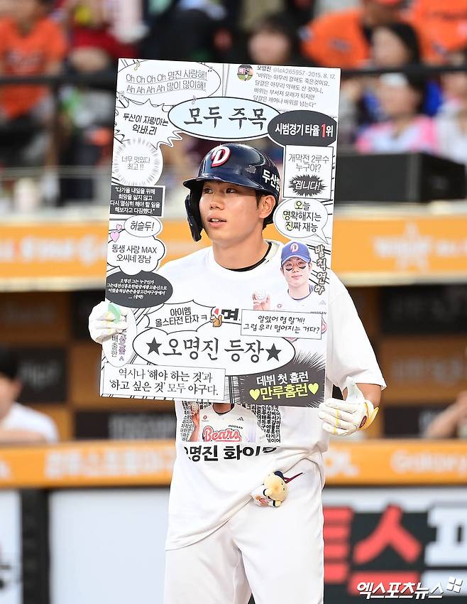 (엑스포츠뉴스 대전, 박지영 기자) 12일 오후 대전 한화생명볼파크에서 열린 '2025 신한 SOL Bank KBO 올스타전' 드림 올스타와 나눔 올스타의 경기, 3회초 1사 1루 드림 오명진이 퍼포먼스를 선보이고 있다.