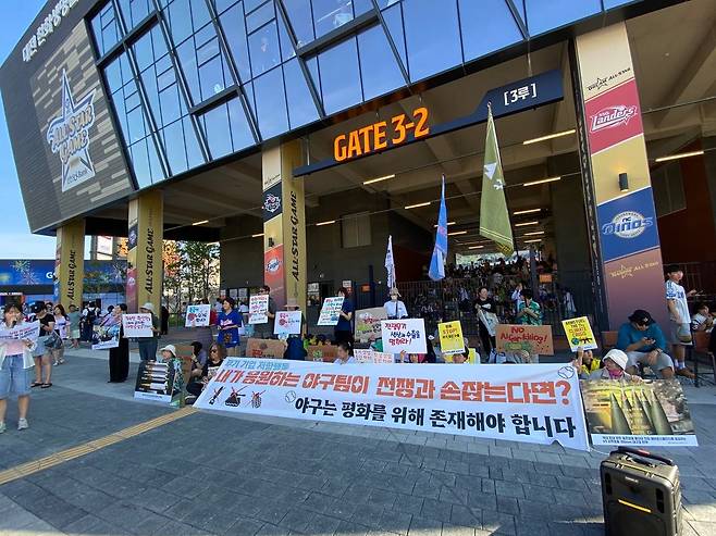 이들은 평화를 촉구하는 기자회견을 왜 한화 프로야구 홈구장 앞에서 연 것일까?