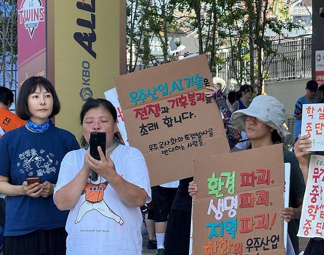 '우주군사화와 로켓발사를 반대하는 사람들' 등 10개 시민사회단체 참가자들은 "최근 한화는 우주 기술과 AI를 활용한 무기 개발과 군사화에 앞장서고 있다"라면서 "대량 살상 무기를 만들고 수출하며 전쟁 산업의 중심에 서 있다"라고 지적했다. 이들은 "평화의 상징이어야 할 야구장이 전쟁 산업의 중심에 선 기업의 이름으로 불리고 있기에, 이곳을 규탄의 장소로 택했다"라고 강조했다.